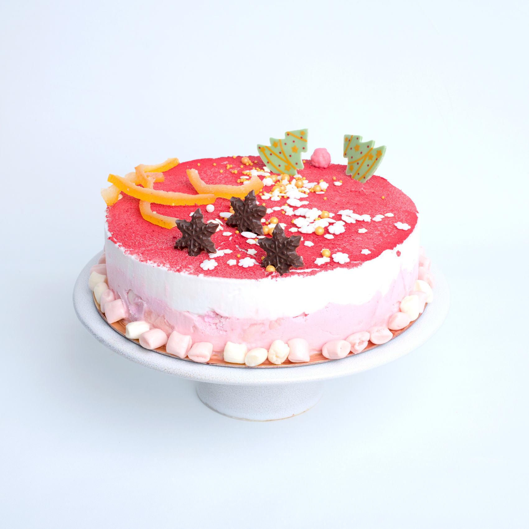 Zoet en zuur samen in het gezelligste kerst ijstaartje uit ons assortiment. De rode spikkels zijn kleine frambozensnoepjes. De marshmallows zijn ook uiteraard zonder gelatine.